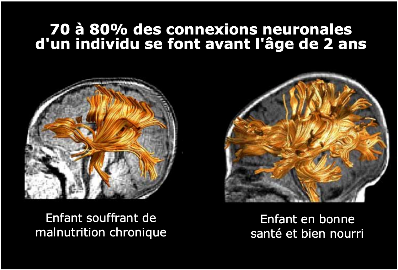 Jusqu’au 2 ans, il est établi que 50 % à 75 % de la nourriture ingérée, par la mère durant la grossesse puis par le bébé ensuite, est utilisée pour fournir de l’énergie au cerveau de l’enfant.